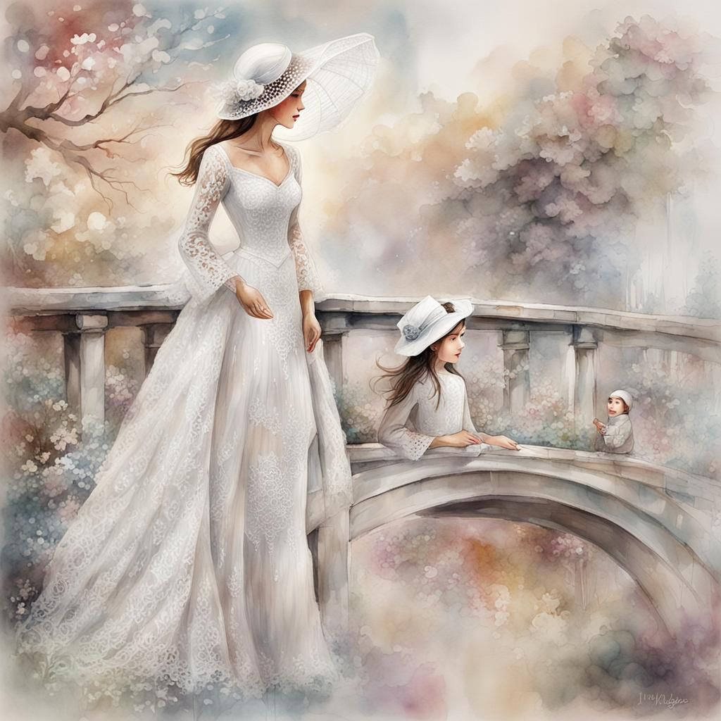 A watercolor and alcohol ink painting of a mother in white lace pushing a baby in a pram across a bridge. The artwork features a cinematic, detailed, and atmospheric composition.