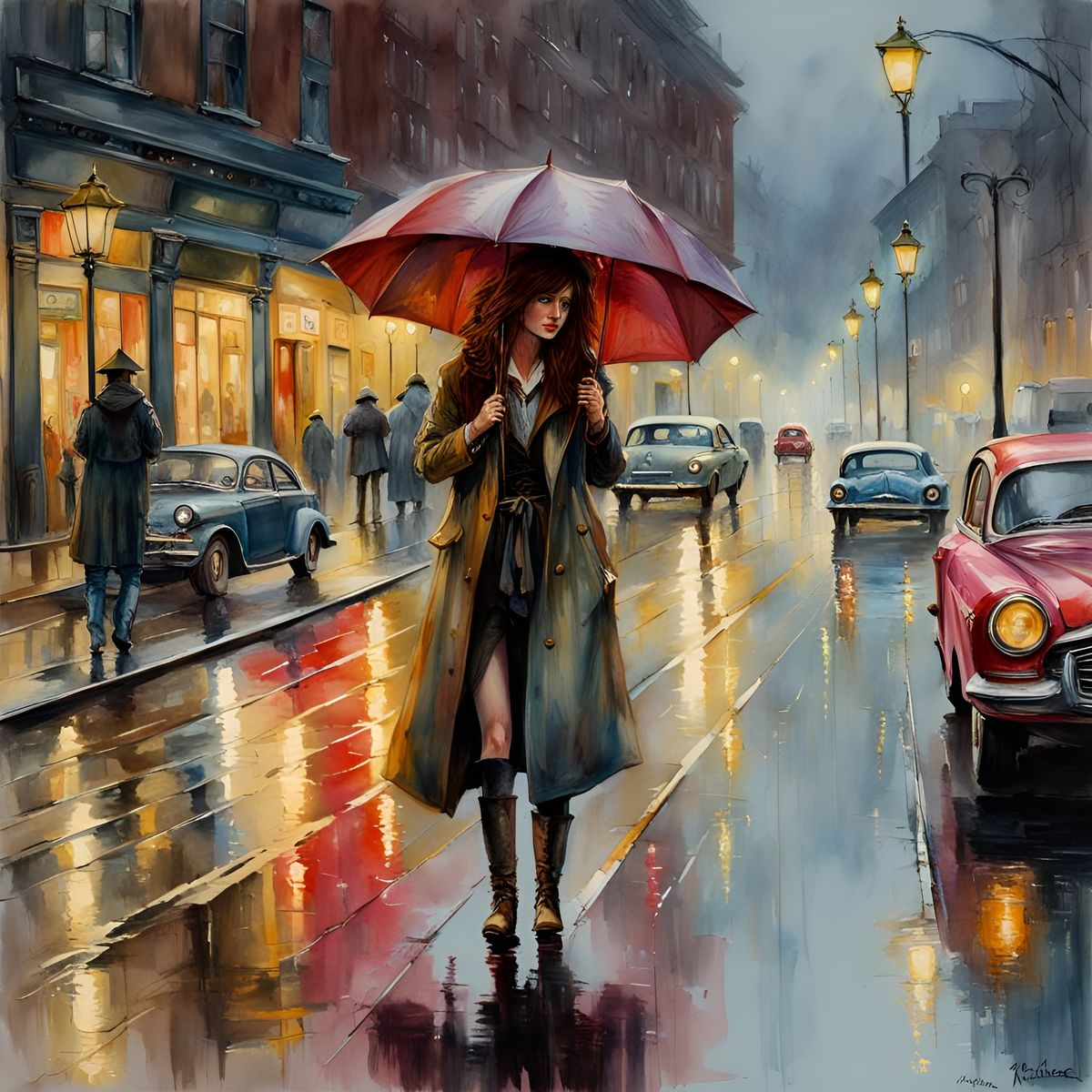 This image shows a rainy street scene at night with reflections on the wet pavement. The artwork is in a loose watercolor style with exquisite lighting and contrasting colors.