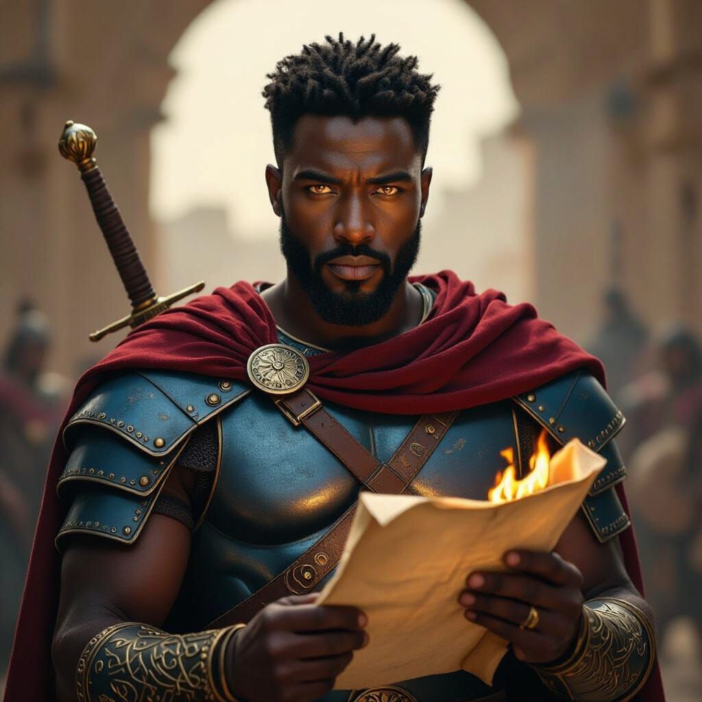 A powerful African warrior from 6th century BC, depicted in a realistic cinematic style. He wears detailed Prussian blue armor and a crimson mantle, holding a sword and scroll.