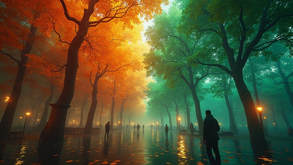 This image shows kinetic pointillism in a vibrant art nouveau aesthetic. The concept art features dynamic lighting, intricate details, and a neon green and orange color palette.