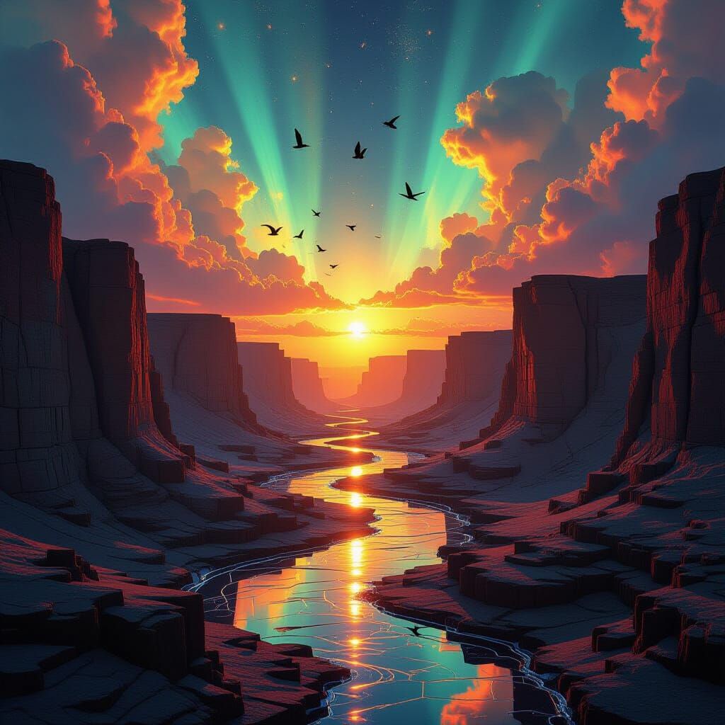 “Surreal canyon illuminated by molten golden rivers, shattered glass walls glowing with iridescent gradients, fractal birds flying through neon aurora skies, layered optical illusion clouds bending above, cinematic and mesmerizing abstract fantasy scene.”