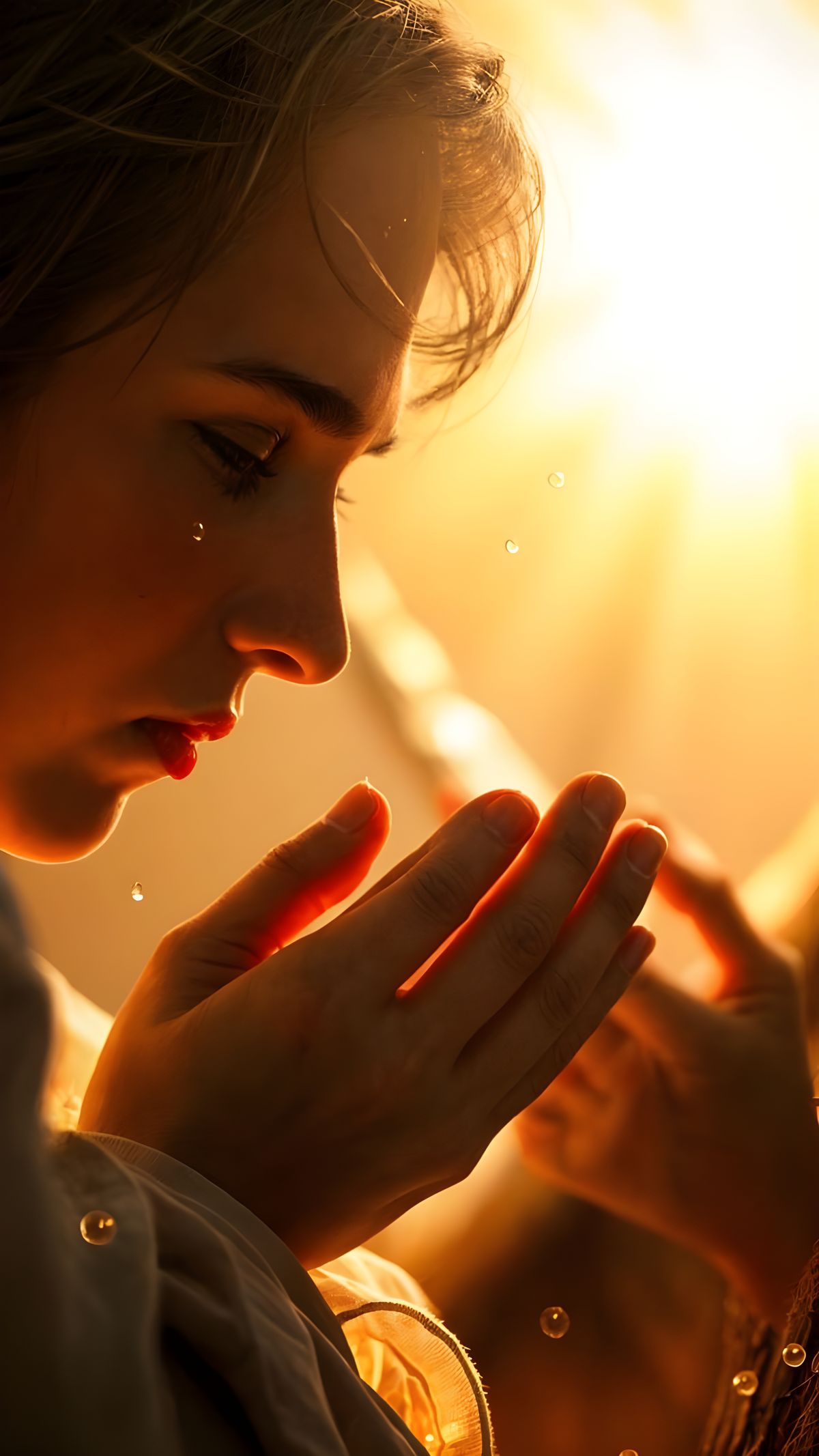 This image shows two young angels kneeling in prayer, overcome with emotion. The divine light emphasizes their sorrow and longing, creating a sacred scene of remorse and silent supplication.
