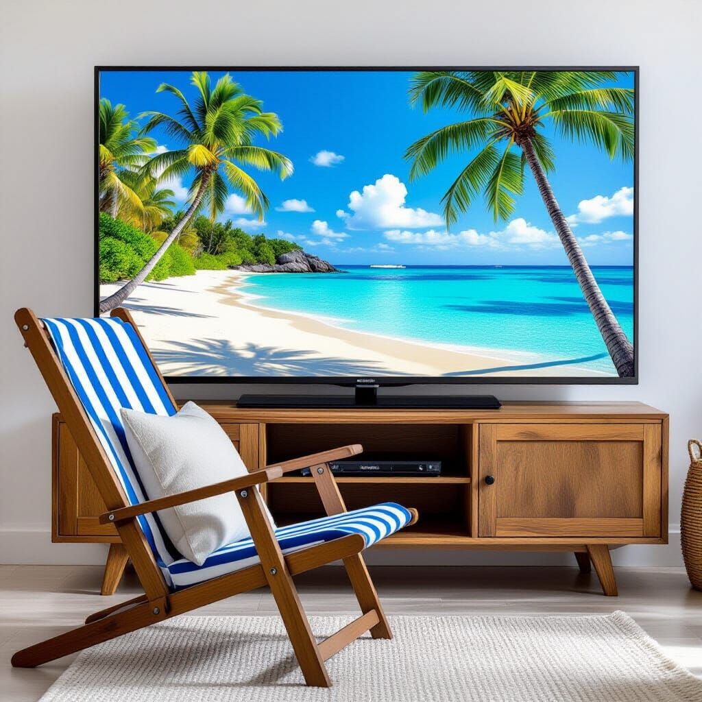 A plush deckchair is placed in a living room before a TV displaying a tropical beach scene, evoking a sense of vacation with vibrant colors and lush imagery.