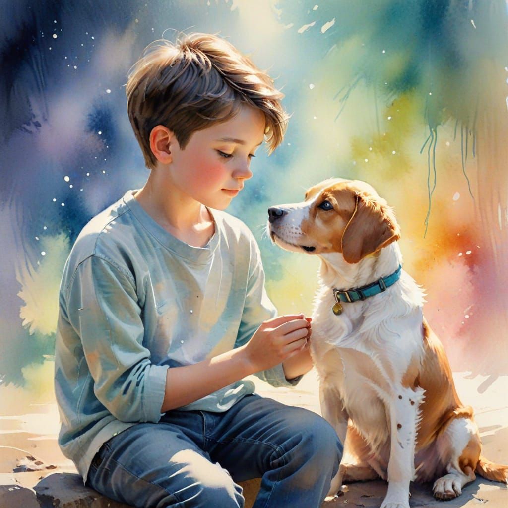 This image shows a boy gently petting a dog in a medium shot portrait. The watercolor art features soft brushstrokes, pastel colors, dreamy lighting and vibrant accents in a whimsical style.