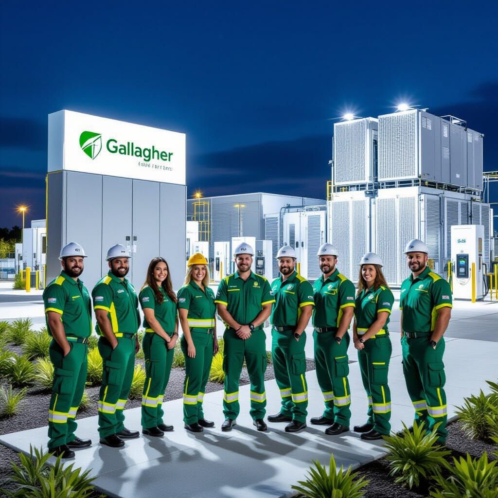 This image depicts the Long Island Power Plant, showcasing Gallagher Electric's new mega battery storage facility. Diverse technicians stand before the eco-friendly site, which features Tesla batteries, EV charging, and hydrogen transfer stations in a futuristic style.