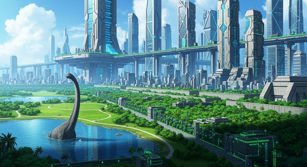 Experience a vibrant anime-style futuristic city with neon-lit skyscrapers, advanced architecture, and a unique blend of nature. A dinosaur emerges from a park lake in this stunning digital art.