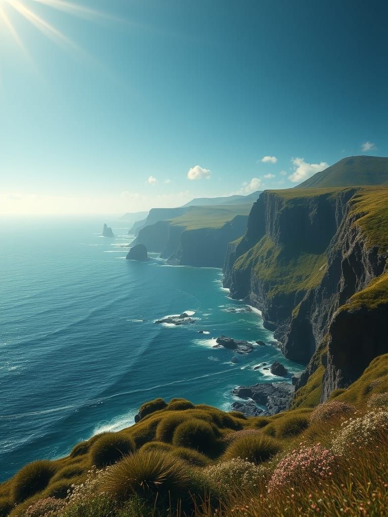 A vibrant image of the Irish coast under a summer sun. The landscape is rendered with rich blues and greens, creating an atmospheric and dramatic scene with cinematic lighting and soft focus.