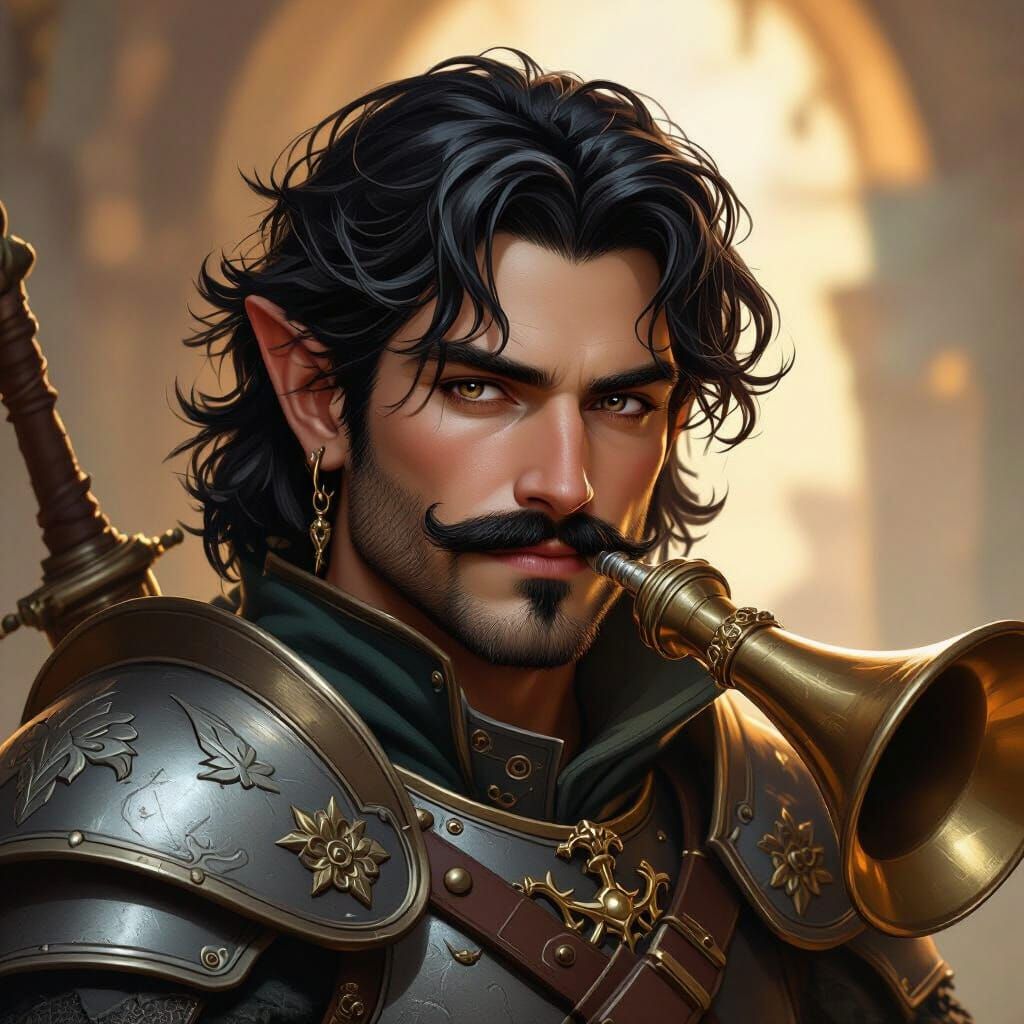 A hyperrealistic fantasy portrait of a 35-year-old halfling bard with a curled mustache and messy black hair, playing a horn. Dramatic warm lighting emphasizes lifelike textures and a painterly finish.