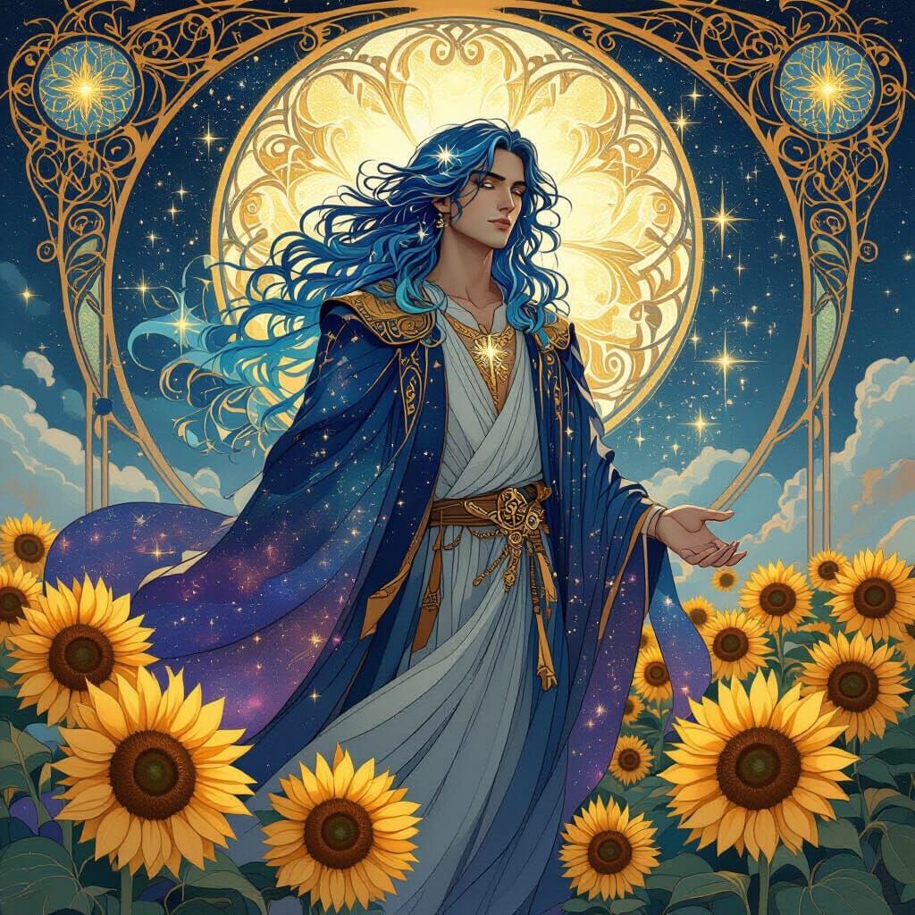 A majestic ethereal spirit with flowing starlight hair stands in a sunflower field. This image evokes art nouveau with flowing lines, organic details, and a dreamy palette of blues, golds, and purples.