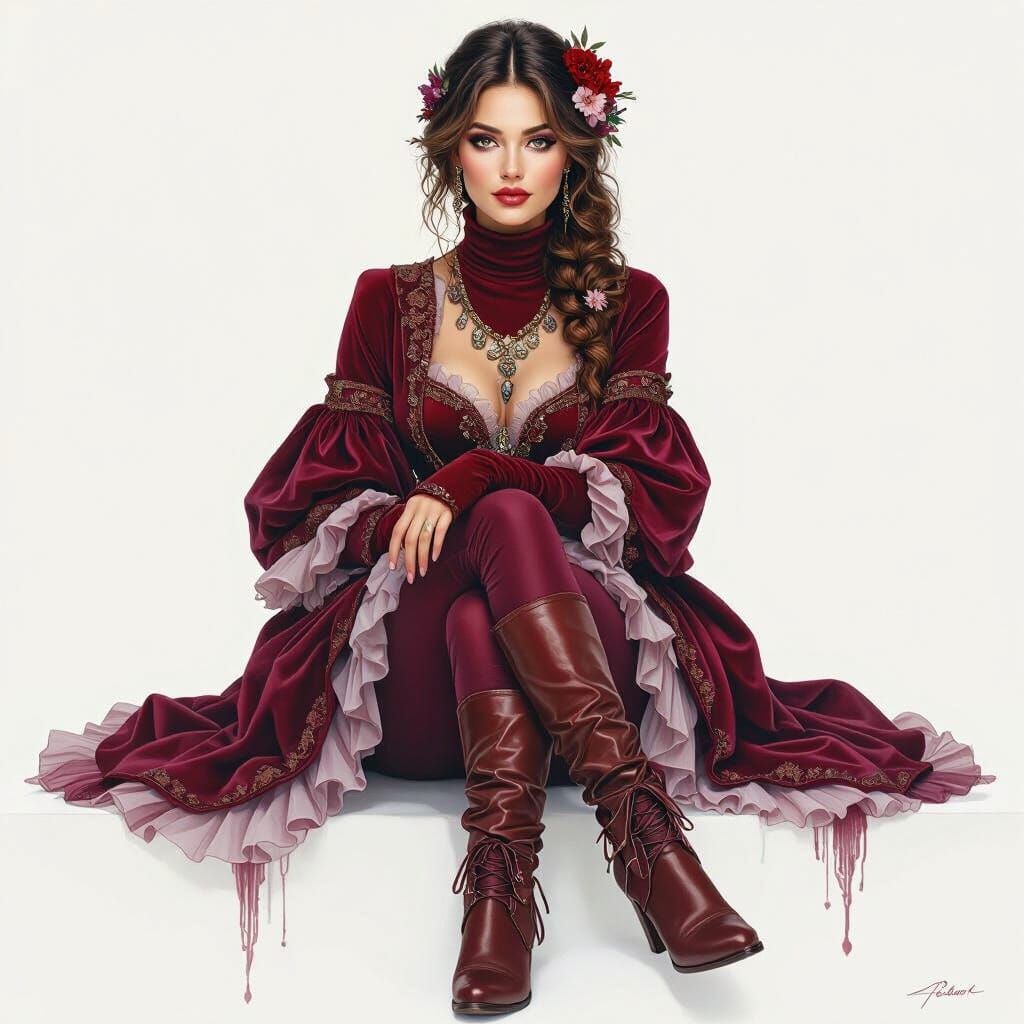 This image showcases a full-body watercolor portrait of a woman in opulent Baroque-style burgundy attire. Hyperrealistic details and shimmering elements highlight her graceful pose.