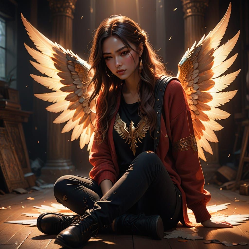 This captivating image depicts a beautiful fairy girl in a fantastical setting, wearing black ripped jeans and red combat boots. Softly glowing wings and vibrant brushstrokes create a dreamlike atmosphere, while the warm color palette and soft focus add to the enchanting mood.