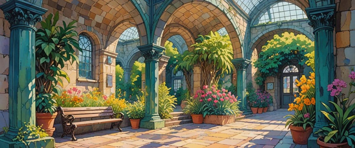 This image shows a vibrant train station in a sprawling underground city. Arches of indigo blue complement the mossy green plants, with magenta flowers and yellow sunlight creating a colorful scene in a comic book style.