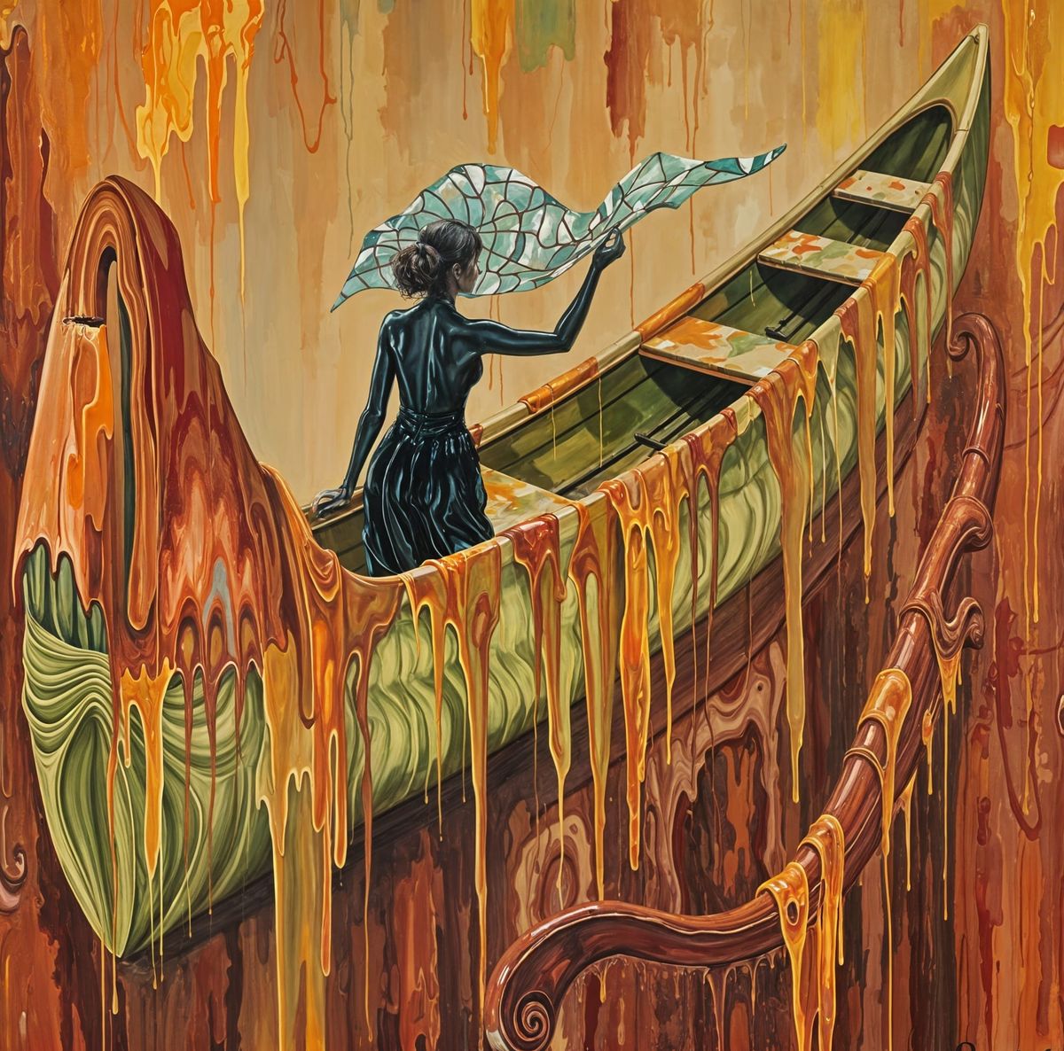 This image depicts a woman standing on a cliff, surrounded by a colossal moss green canoe emerging from a dynamic, dripping paint backdrop, reminiscent of Jackson Pollock's style, with thick, layered strokes of warm colors.