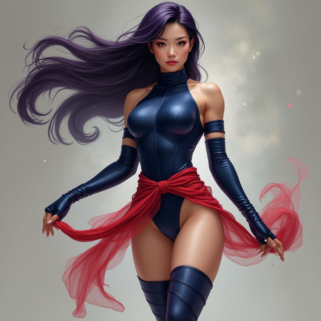 A striking image of a powerful Asian woman with flowing purple hair, clad in a blue leotard with red sash. The artwork features intricate details and textures in an art nouveau style.