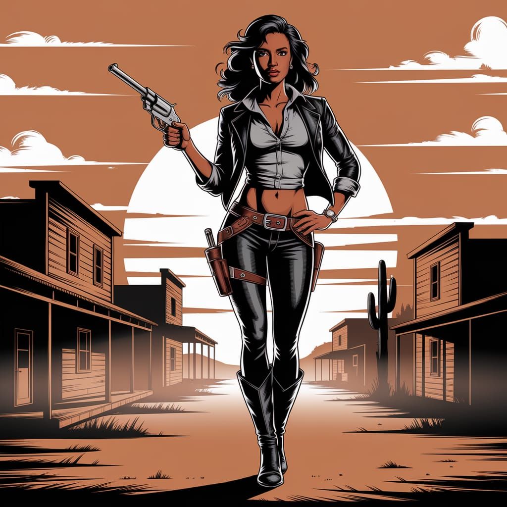 A striking picture of a confident black female gunslinger silhouetted against a warm sunset. She wears a dark leather jacket and jeans, holding a revolver against a sparse, dusty frontier town.