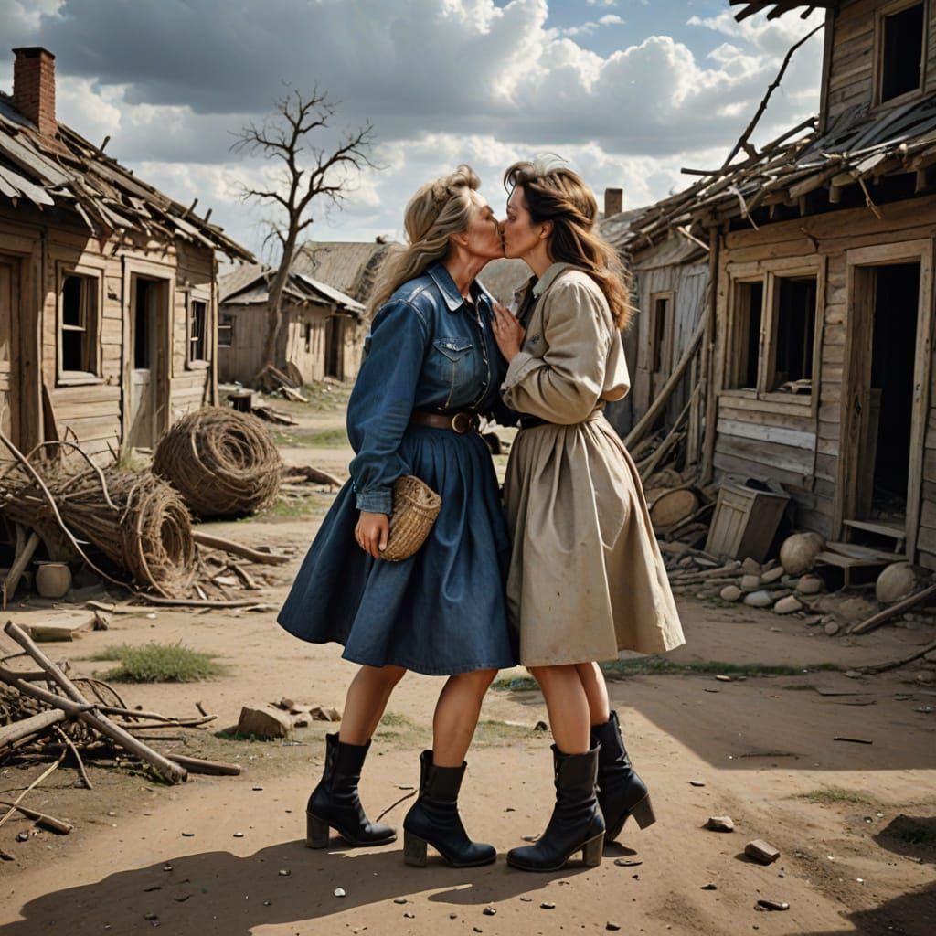 This image captures a poignant moment between two women in a deserted Far West village. They share a tender kiss amidst the windy weather, surrounded by the remnants of a once-thriving town. The women, dressed in cowboy attire, add a touch of nostalgia to the scene.