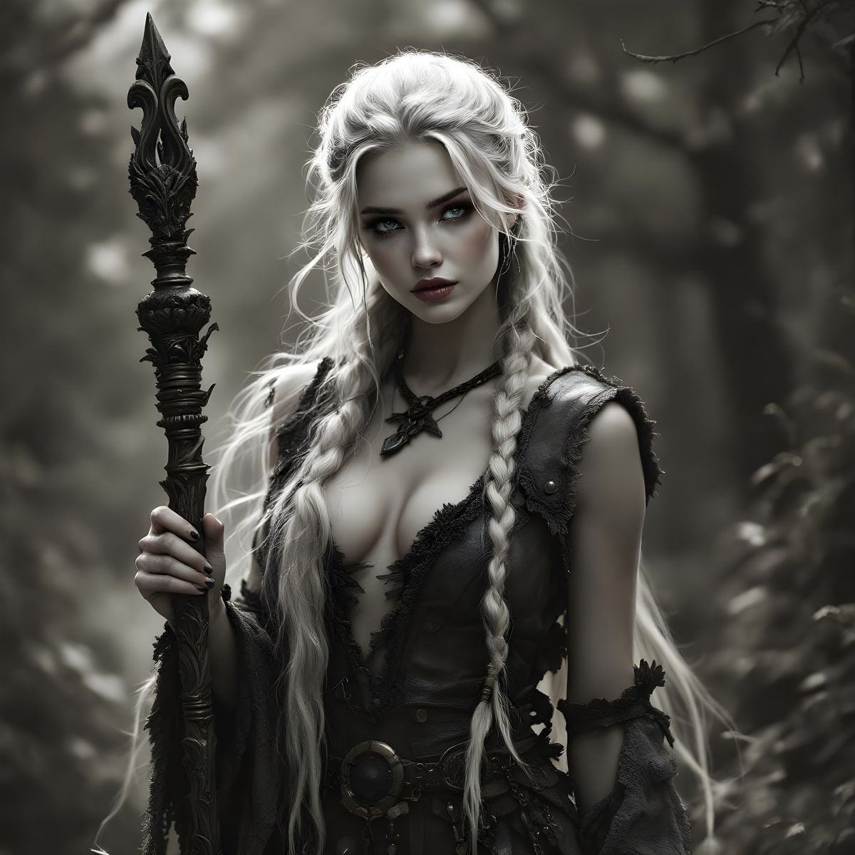 This artwork depicts a Norse goddess in a fantasy setting. She has long blonde hair and wears a leather jerkin, holding a wooden staff, rendered in a black and brown color palette.