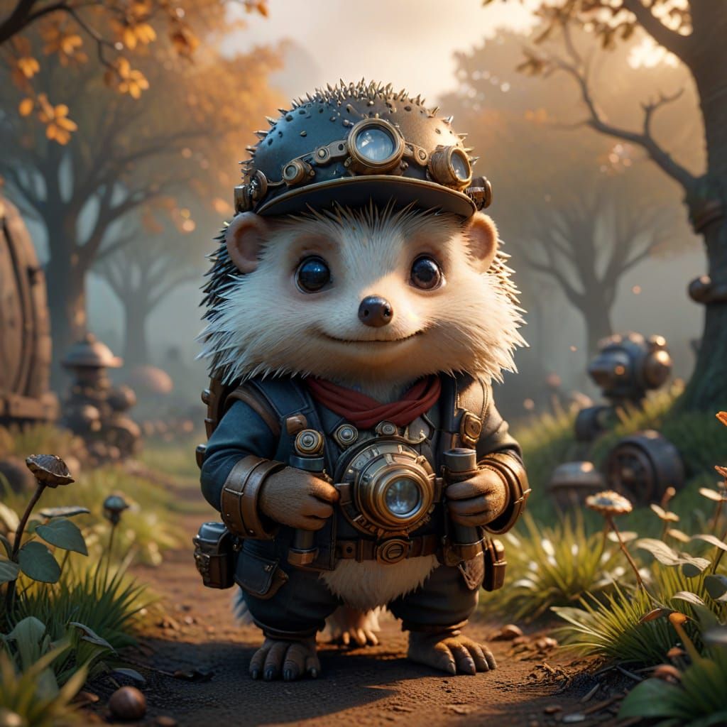 A charming, Pixar-inspired chibi hedgehog in traditional Korean clothing and fedora holds binoculars, set against a misty, golden-hour backdrop of a nut orchard with intricate steampunk details, rendered in a cinematic film still style