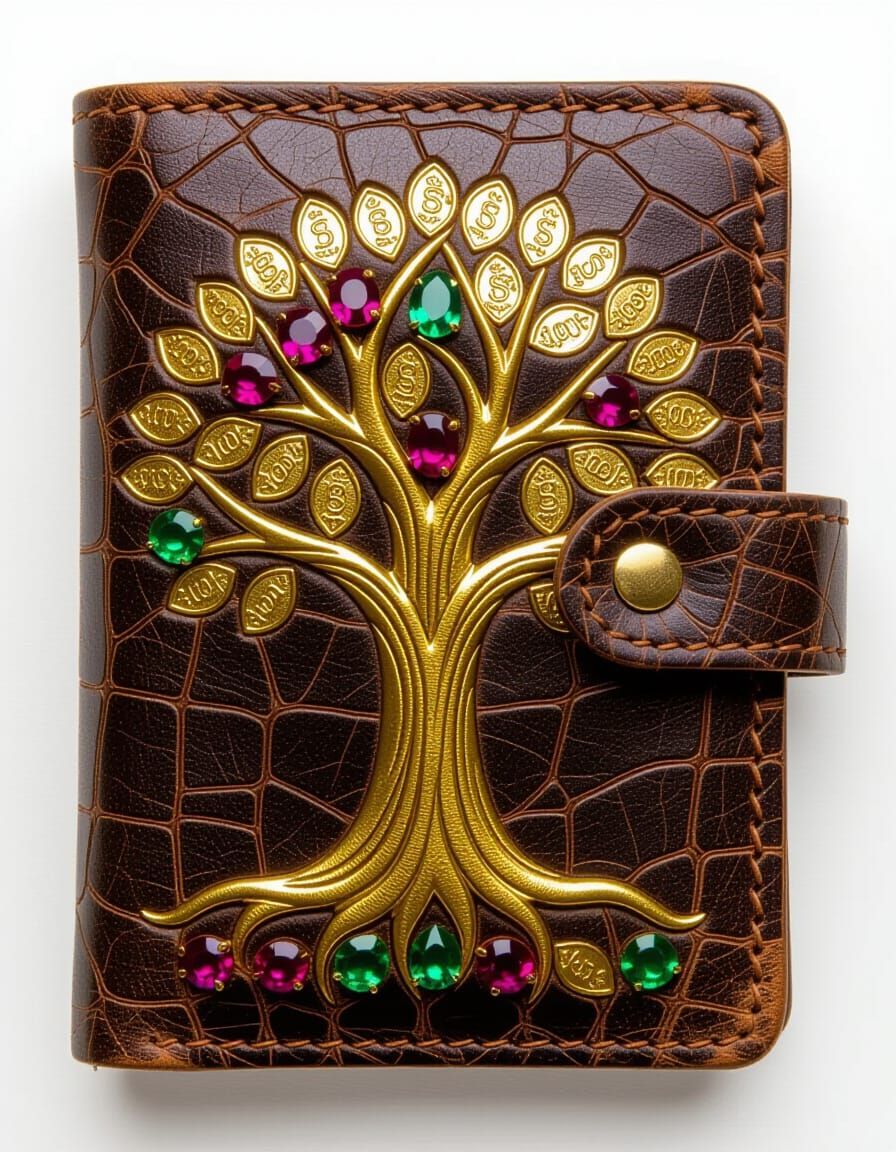 This image shows a leather wallet sprouting a money tree with gold coin leaves and gem-encrusted branches. The artwork evokes a sense of prosperous wonder in an art nouveau style.