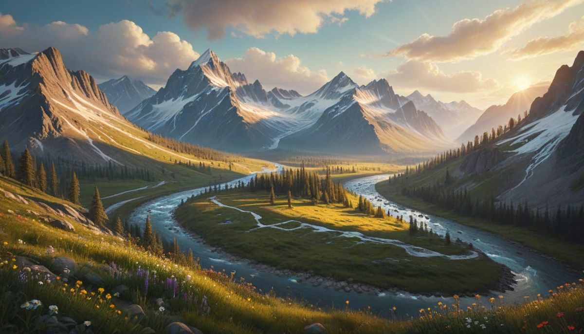 A digital painting shows a mountain valley with river and wildflowers, reminiscent of Shishkin. Golden light illuminates snow-capped peaks under a vibrant sky. This image is best quality, photorealistic with detailed textures.