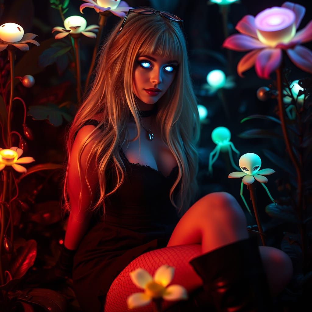 This image shows a goth woman with glowing eyes in a dark dress, boots and fishnets. Luminous plants and subtle aliens surround her in a Film Noir aesthetic with holographic accents.