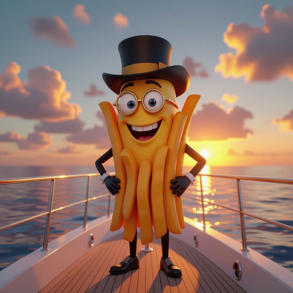 This ultra-realistic digital illustration shows an anthropomorphic French fry wearing a hat and monocle on a yacht deck. The scene features vivid colors and cinematic lighting during a sunset over a calm ocean.