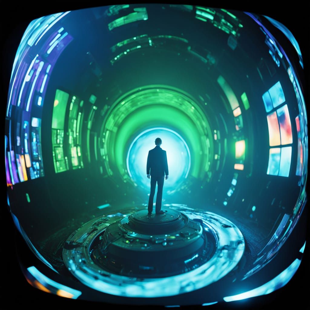 This image depicts a surreal awards ceremony in a graveyard, blending vibrant colors and mystic lights with a grainy VHS aesthetic and dark cinematic effects. A space-time tunnel and ghostly creatures add to the fantastical atmosphere, while a static CRT television and holographic displays create a sense...