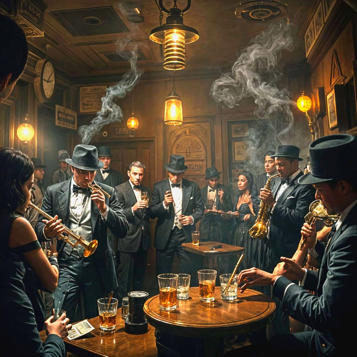 A vivid image capturing a clandestine jazz club scene reminiscent of the Roaring Twenties. The scene is filled with gangsters, flapper girls, and a jazz band, rendered with a gritty, film noir aesthetic.