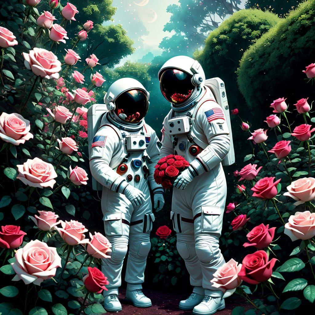 A surreal mixed media artwork depicting two astronauts in detailed white suits within a garden of vibrant pink and red roses. One astronaut holds a rose bouquet, under soft starlight.