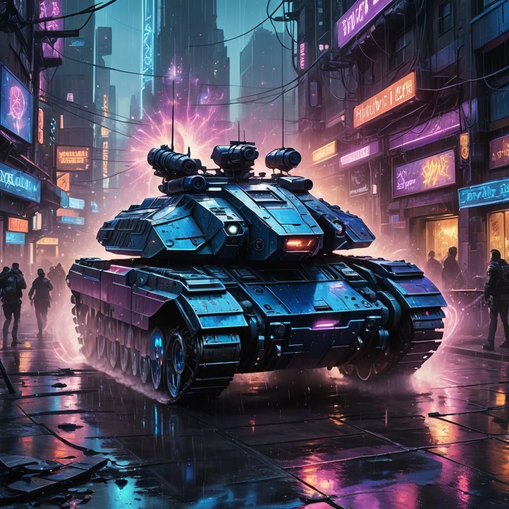 A striking picture of a heavily armored laser tank in a cyberpunk city. The tank features glowing blue cannons and iridescent metallic surfaces, illuminated by neon lights in a dark, gritty cityscape.