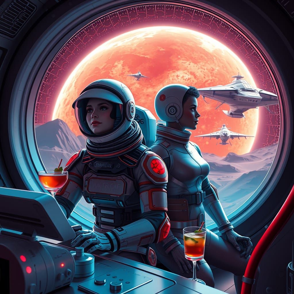 This image shows a humanoid robot waitress in a futuristic space cafe on an asteroid, chatting with two astronauts from Earth and Mars, surrounded by neon cocktails and stunning views of the galaxy.