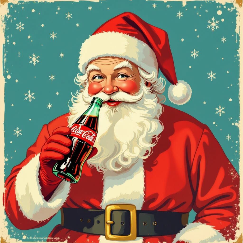 This image depicts Santa Claus enjoying a glass bottle of Coca-Cola, rendered in the nostalgic style of a vintage advertisement.