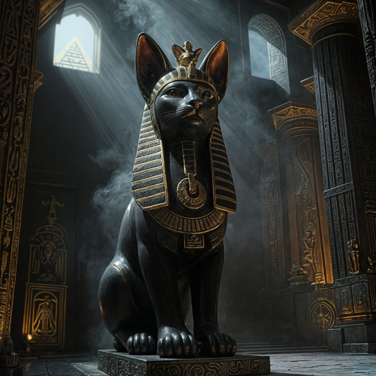 A mysterious temple in 1940s film noir style, adorned with a majestic golden Egyptian cat statue, exuding luxury and intrigue.