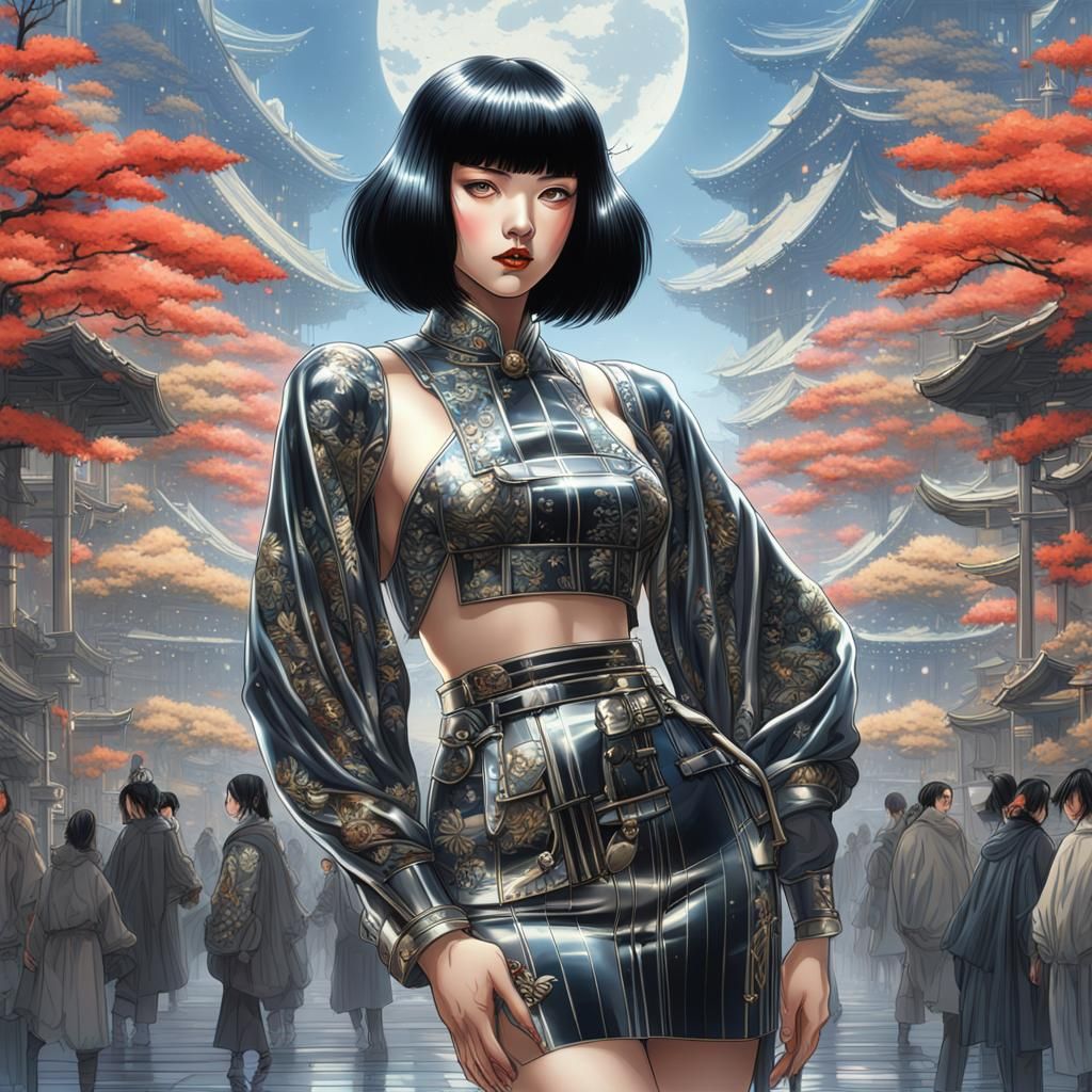 This image depicts a voluptuous goth woman with a black bob, pale skin, and curves, adorned in traditional Japanese attire as a detailed matte painting with deep colors.