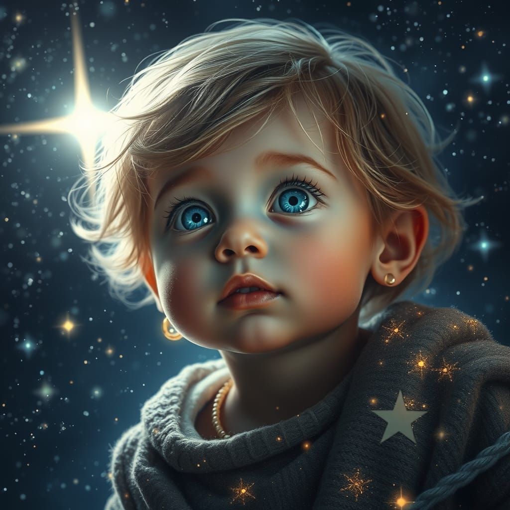 This image shows a star child with big blue eyes amidst a backdrop of stardust in the night sky. The digital matte painting is cinematic, dramatic, and meticulously detailed.