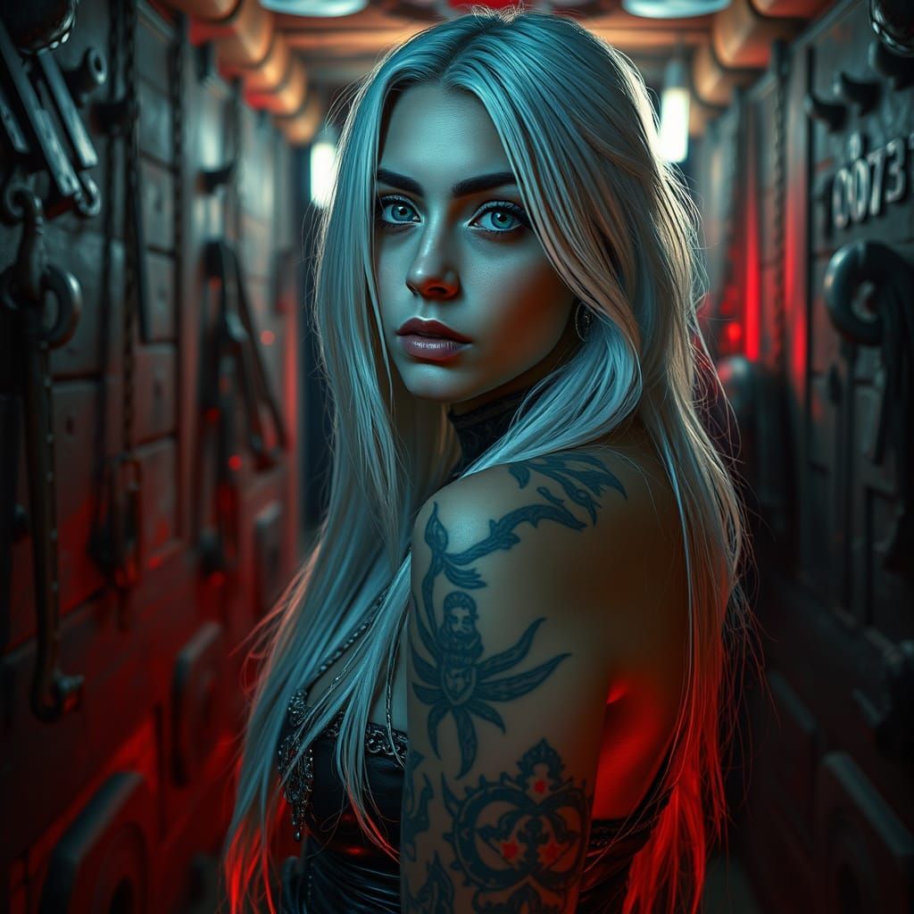 A hauntingly beautiful digital painting of a European woman with long white hair and shining blue eyes, adorned with tattoos and metal jewelry, standing in a dimly lit, ancient dungeon surrounded by a blood red glow, as if emerging from the shadows.