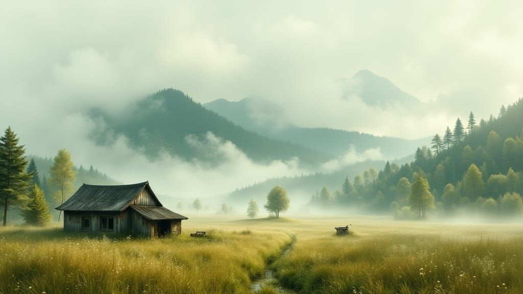 This image depicts a solitary, weathered Chinese farmhouse on a forgotten meadow, enveloped in gentle mist. Overgrown rustic cabins and decaying architecture evoke a sense of nostalgic isolation and nature's reclamation. Rendered in a painterly concept art style with soft lighting.