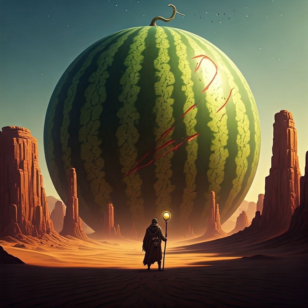 A striking picture of an enormous watermelon dominating a tiny desert. The melon's skin features ancient markings, with a robed explorer gazing up. Rendered with surreal, whimsical artistry and cosmic wonder.