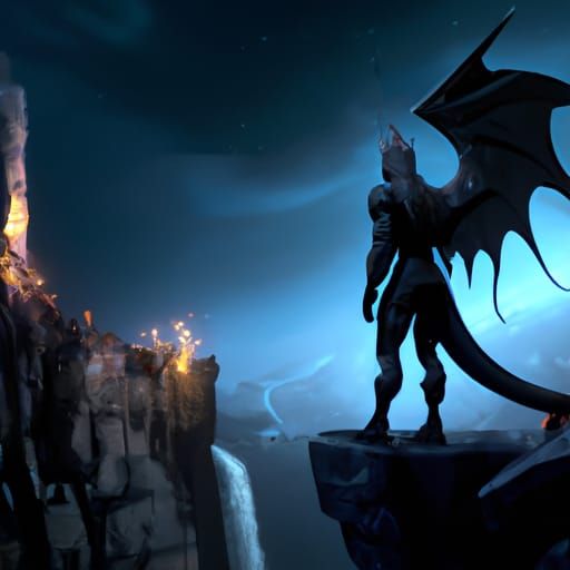 This image shows a god of the night surveying his realm in a dark fantasy concept art style. The artwork features dynamic and volumetric lighting with intricate details and deep, complementary colors.
