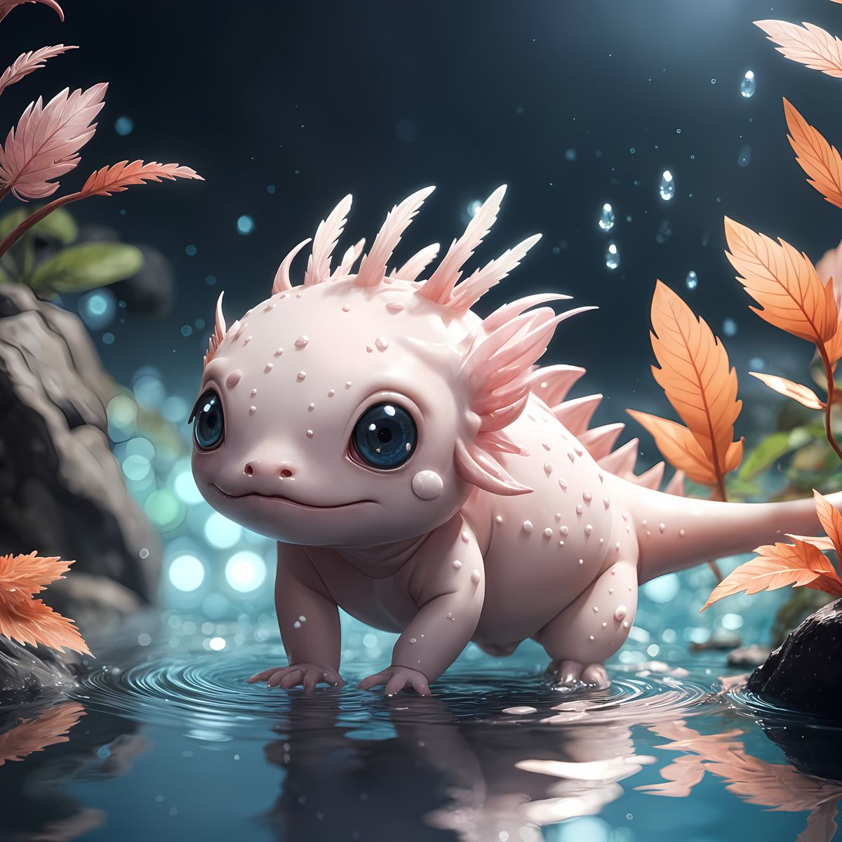 This image shows a charming axolotl rendered as 3D anime art. The aesthetic is highly detailed, inspired by concept art, and presented in breathtaking 8k resolution.