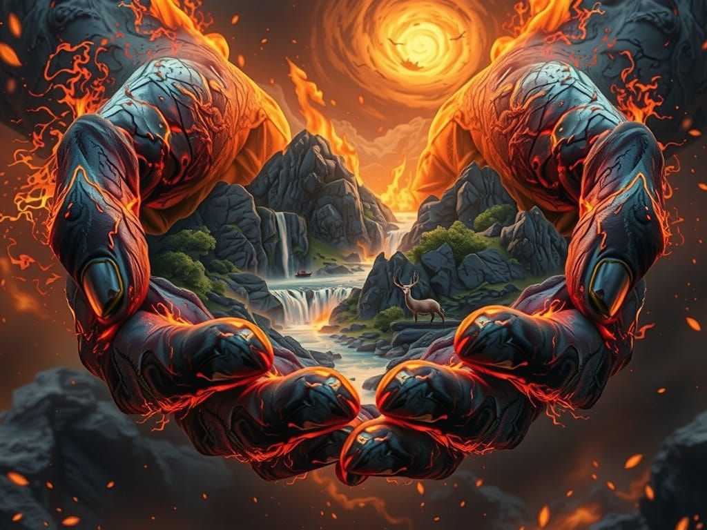 A striking picture of colossal, fiery hands cradling a miniature fantasy world. The landscape features a waterfall, lake, and forest threatened by an approaching storm, all rendered with cinematic detail.