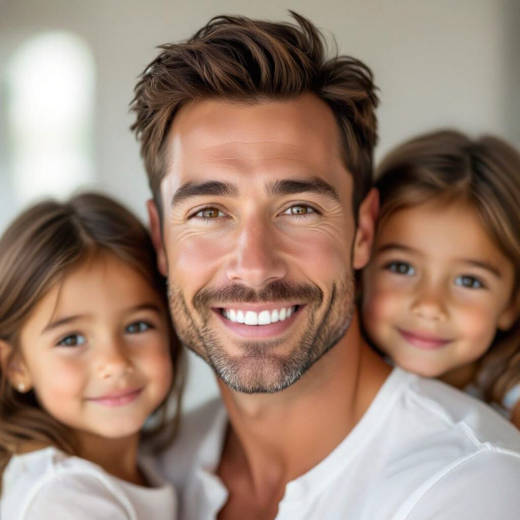This image features a realistic, handsome man with a strong tan, short brown hair, and kind brown eyes. He has a friendly smile and appears in a cinematic, high-resolution photo with soft, natural lighting.