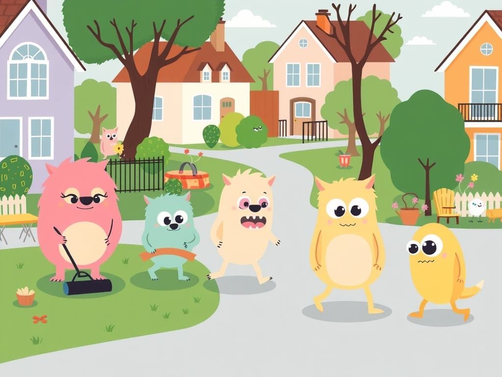 This image shows a cheerful neighborhood populated by colorful, friendly monsters enjoying everyday activities. The scene is rendered in a flat, 2D style with soft shapes and warm colors, reminiscent of a children's picture book.