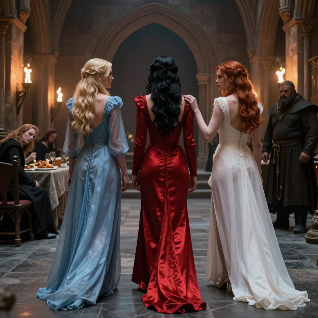 A cinematic low-angle shot captures three elegant women walking away in a dimly lit medieval hall. Torches flicker, and a warrior stands near the arche...