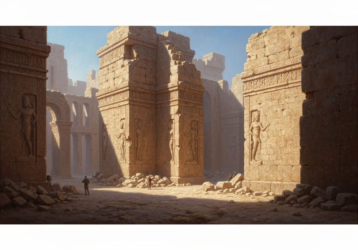 A hyperrealistic and awe-inspiring image of a lost city being excavated. The scene evokes the style of oil paintings, reminiscent of historical masters.