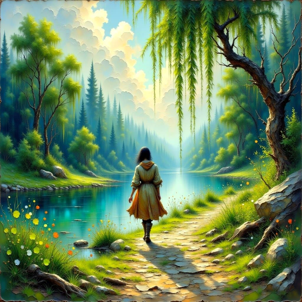 A serene waterscape featuring weeping willows along a river. The image evokes a sense of peace with deep green, aqua, blue, and white tones, rendered with craquelure and volumetric hard brush strokes.
