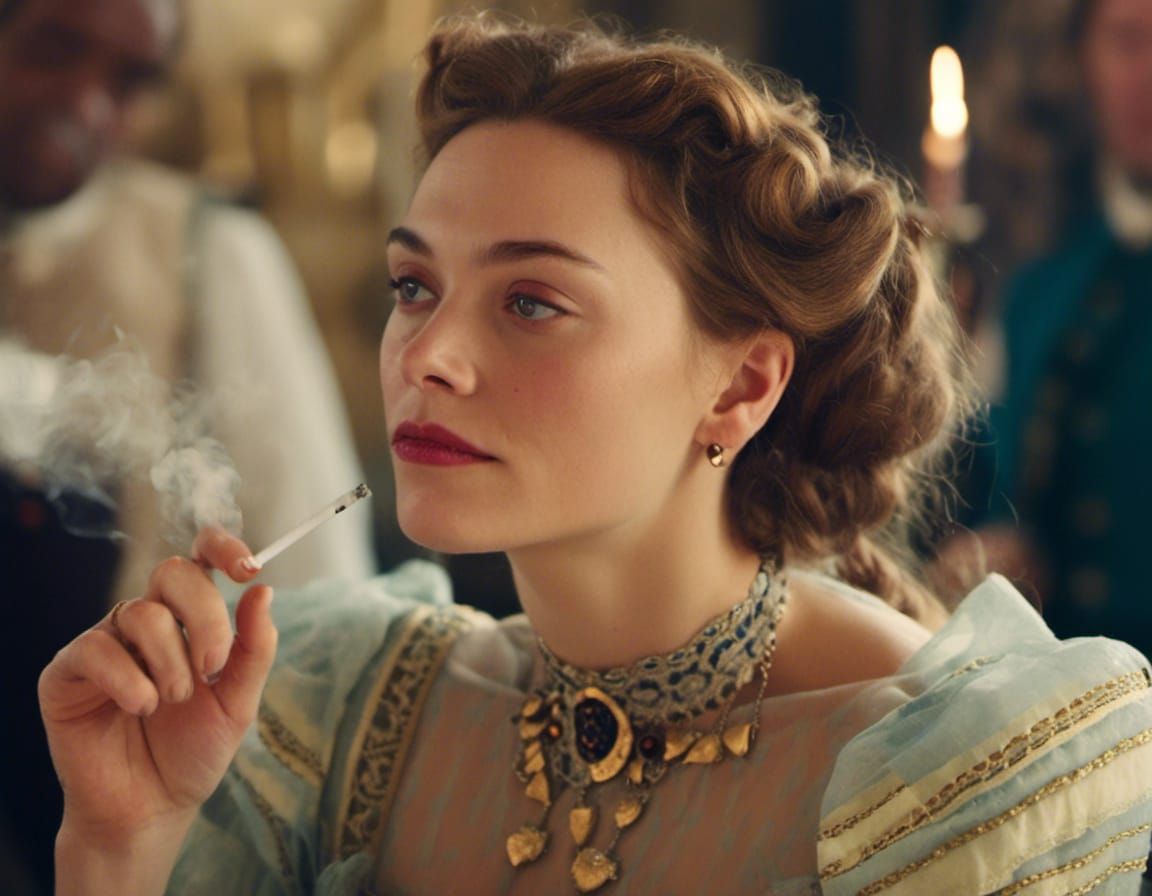 This image shows a close-up of a regal woman smoking inside a palace. The portrait evokes a sense of historical elegance combined with a modern, rebellious twist.