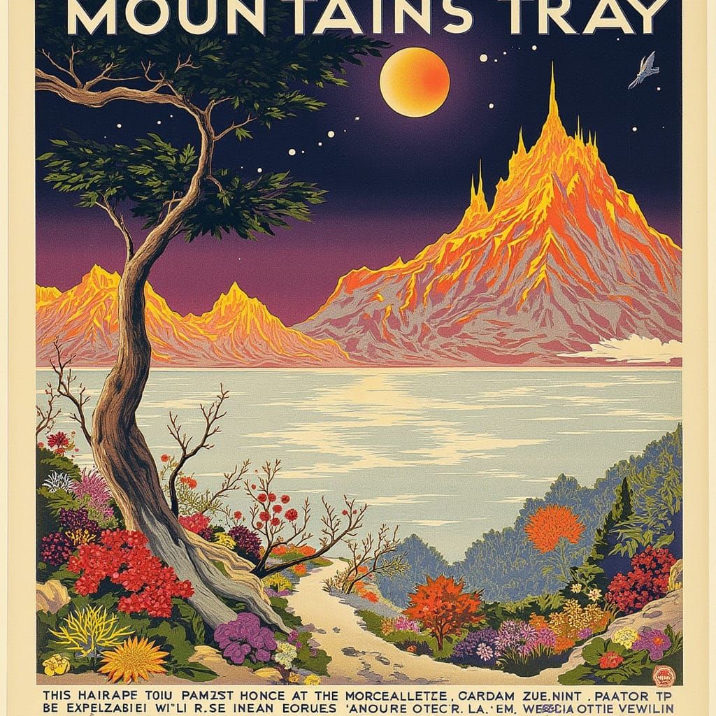 This image shows a cosmic mountainscape in art deco style, reminiscent of a vintage travel poster. The overall aesthetic blends anime and Renaissance elements with floral designs.