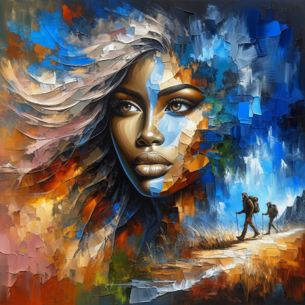 An compelling artwork featuring a large, abstract portrait of a Hispanic woman with flowing blonde hair, partially fragmented against an intense blue and orange backdrop. Africa has striking facial features, with her full lips, keen eyes conveying a sense of wonder, and the ethereal beauty on her face. ...