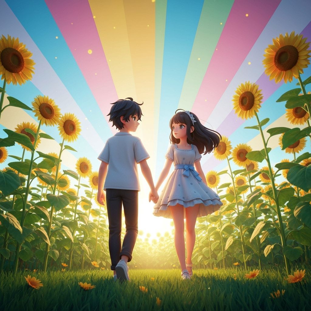This image shows a boy and girl walking hand-in-hand through a sunflower-filled park. Rendered as 3D anime art with bright colors and cinematic lighting, it evokes the style of Genshin Impact.